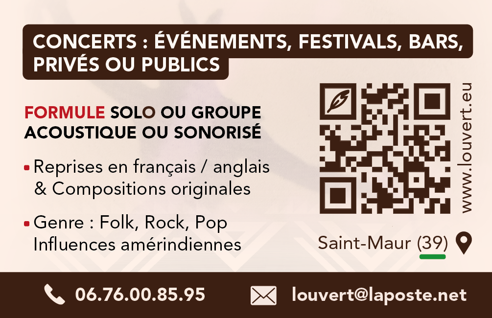 Bernard Louvert était en animation lors de la Percée du vin jaune les 31 janvier et 1er février 2026 à Lons-Le-Saunier Louvert renouvelle sa carte de visite et ses concerts Animation privée pour une association le 22 novembre 2025 avec »Les pommiers du bas »Louvert avec quelques membres du groupe »Little Mountain bluegrassband »Je joue parfois les solistes avec les »Gospel friends »Animation privée de LOUVERT au café des artistes à St Maur Jura le 26 août 2025Fin de concert dansante au moulin de Burignat le 10 août 2025… avec Les Pommiers du bas !Drowsy Maggie par »Les pommiers du bas » au Moulin de Burignat le 10 août 2025Louvert fin de concert à la guinguette de Tramelans le 11 juillet 2025Ambiance de concert pour la fête de la musique 2025 avec Les Pommiers du basLes Pommiers du Bas étaient en concert le 21 juin 2025 à L’Irish Pub de Lons-Le-Saunier…Pour tous les renseignements voir la page concerts.Les Gospel Friends en concert le mardi 24 juin 2025 à l’église de MarnéziaFête de la musique 21 juin 2025 face à l’Irish Pub à Lons Le Saunier (Jura)Les Pommiers du Bas animeront les marchés de Rye ( 22 mai 2025) et Quintigny ( 28 aôut 2025) vers 19h et joueront pour la fête de la musique le 21 juin à L’irish pub à Lons-Le-Saunier à partir de 21h.Belle ambiance avec les »Pommiers du bas » à L’Irish Pub pour la St Patrick 2025 !Musiciens : Bernard Buguet, Rémy Manéra, Alain Pouchoux, J.Pierre Luddens, Michel Trossat, Bernard JouliaLes pommiers du bas en concert à L’Irish Pub le 15 mars 2025 21h Lons-Le-Saunier